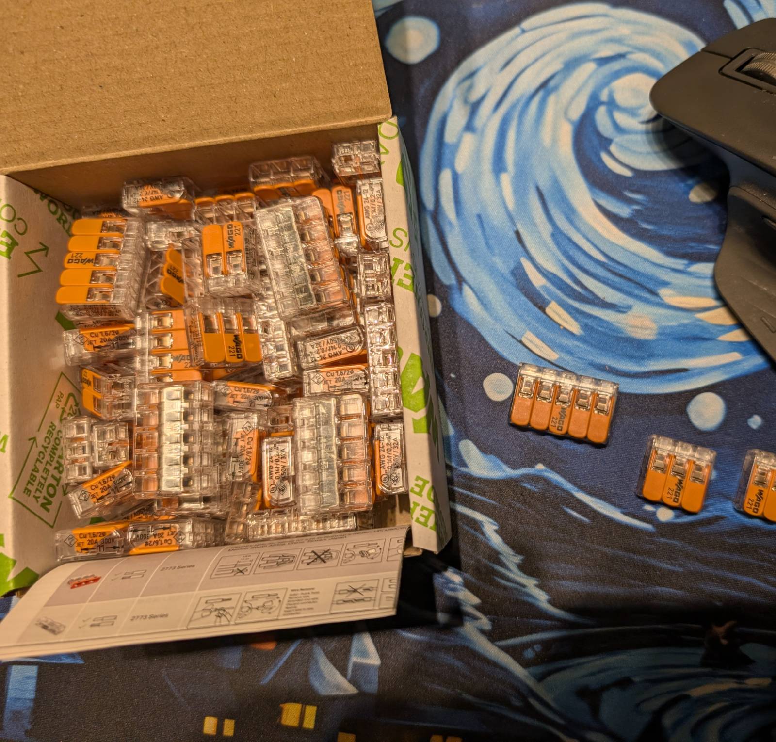 Die Lösung: WAGO 221-Klemmen. Das sind kleine orangefarbene Verbinder, in die man Kabel einfach einklemmt – kein Löten, kein Werkzeug. Man klappt den orangen Hebel hoch, steckt das Kabel rein, klappt zu. Fertig. Und das Beste: Man kann die Verbindung jederzeit wieder öffnen wenn man etwas ändern will!
