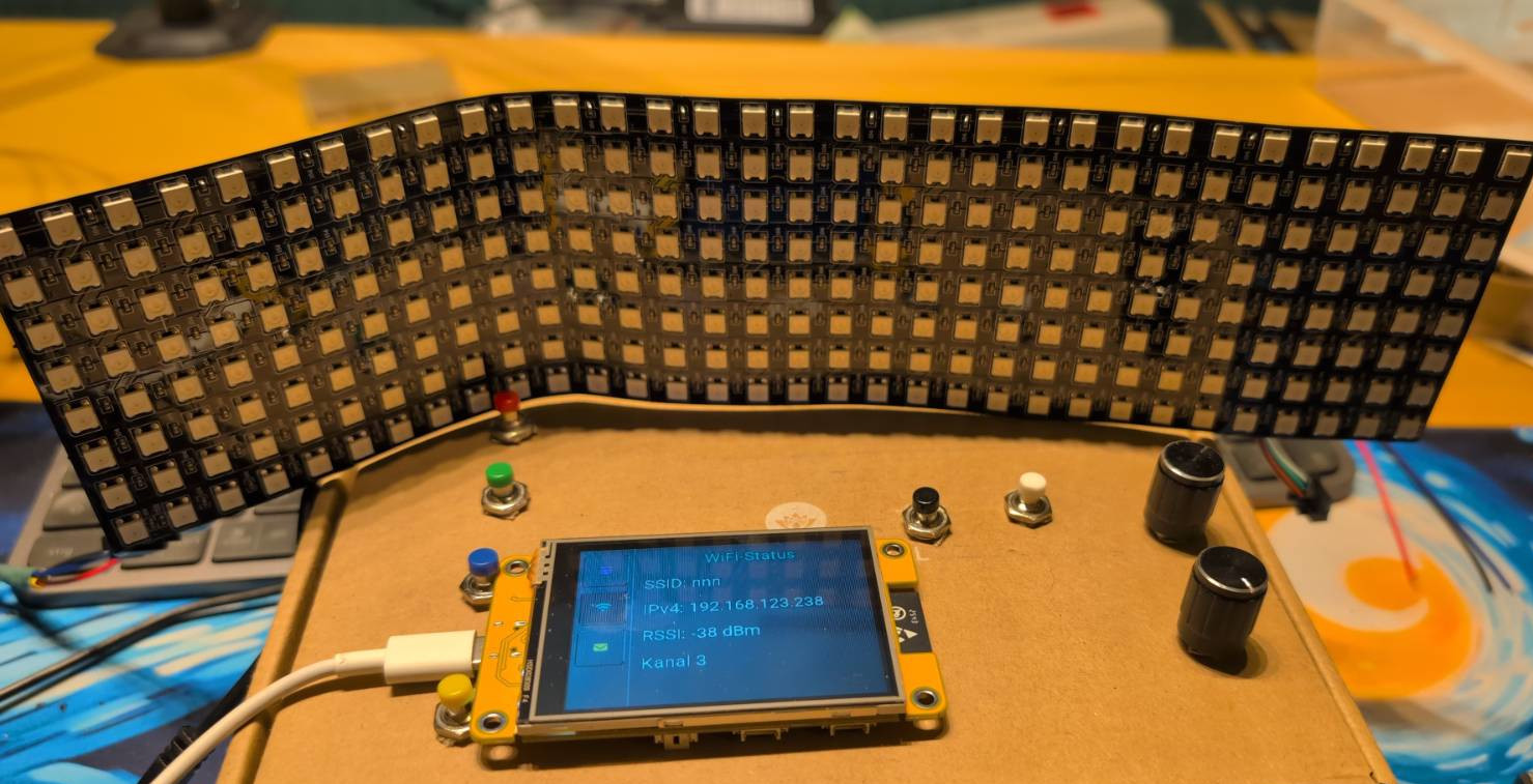 In Teil 1 habe ich die LED-Matrix gebaut, in Teil 2 das Bedienfeld mit Drehknöpfen. Jetzt kommt das letzte Stück: Gelb – das Gerät mit dem Touchscreen-Display, das alles zusammenhält.